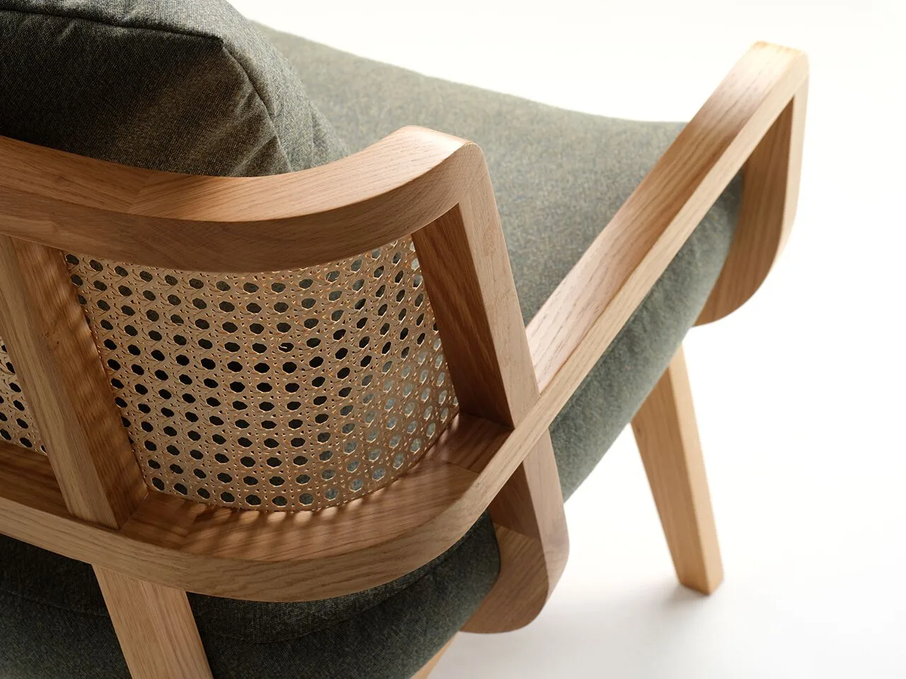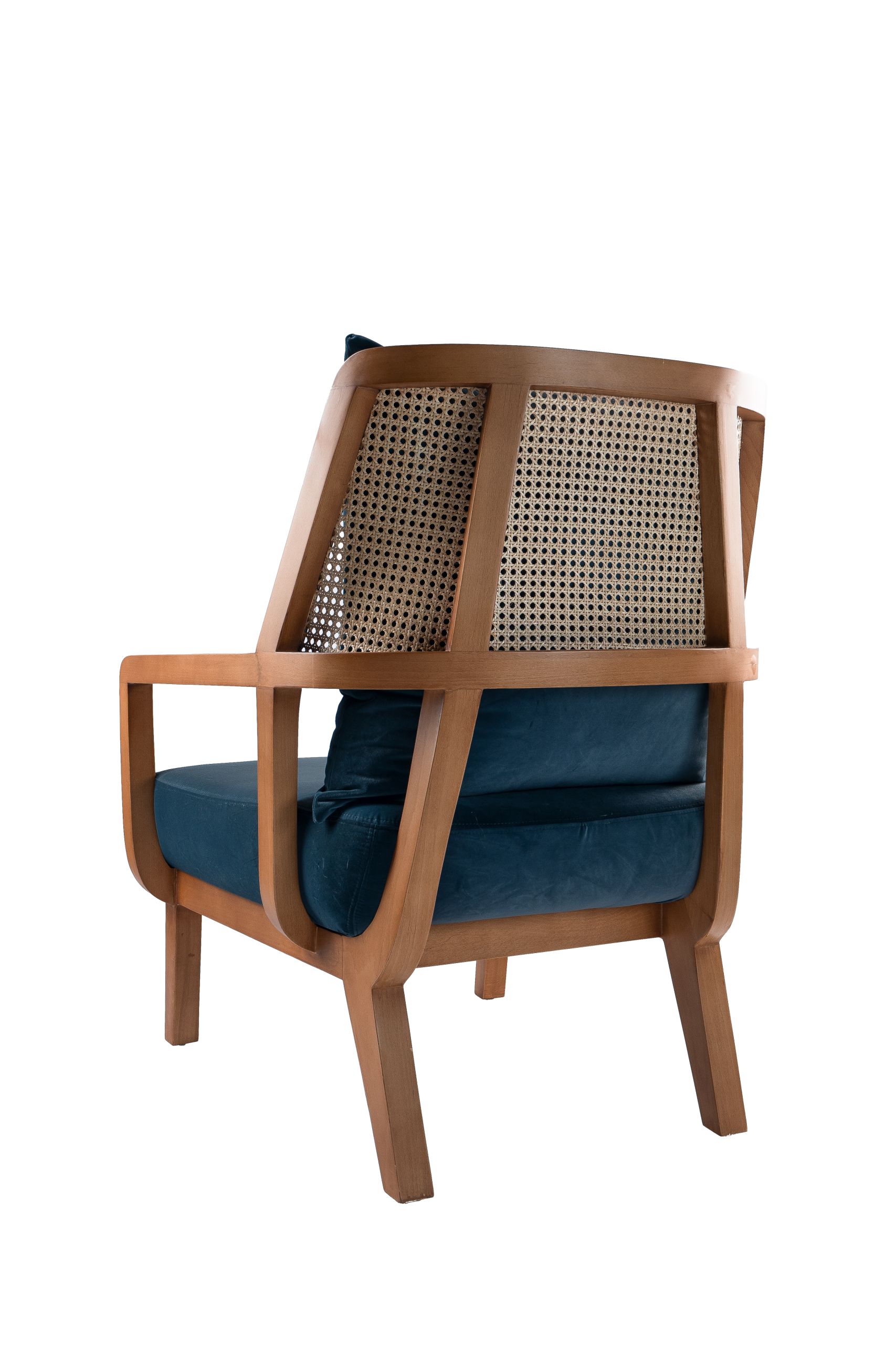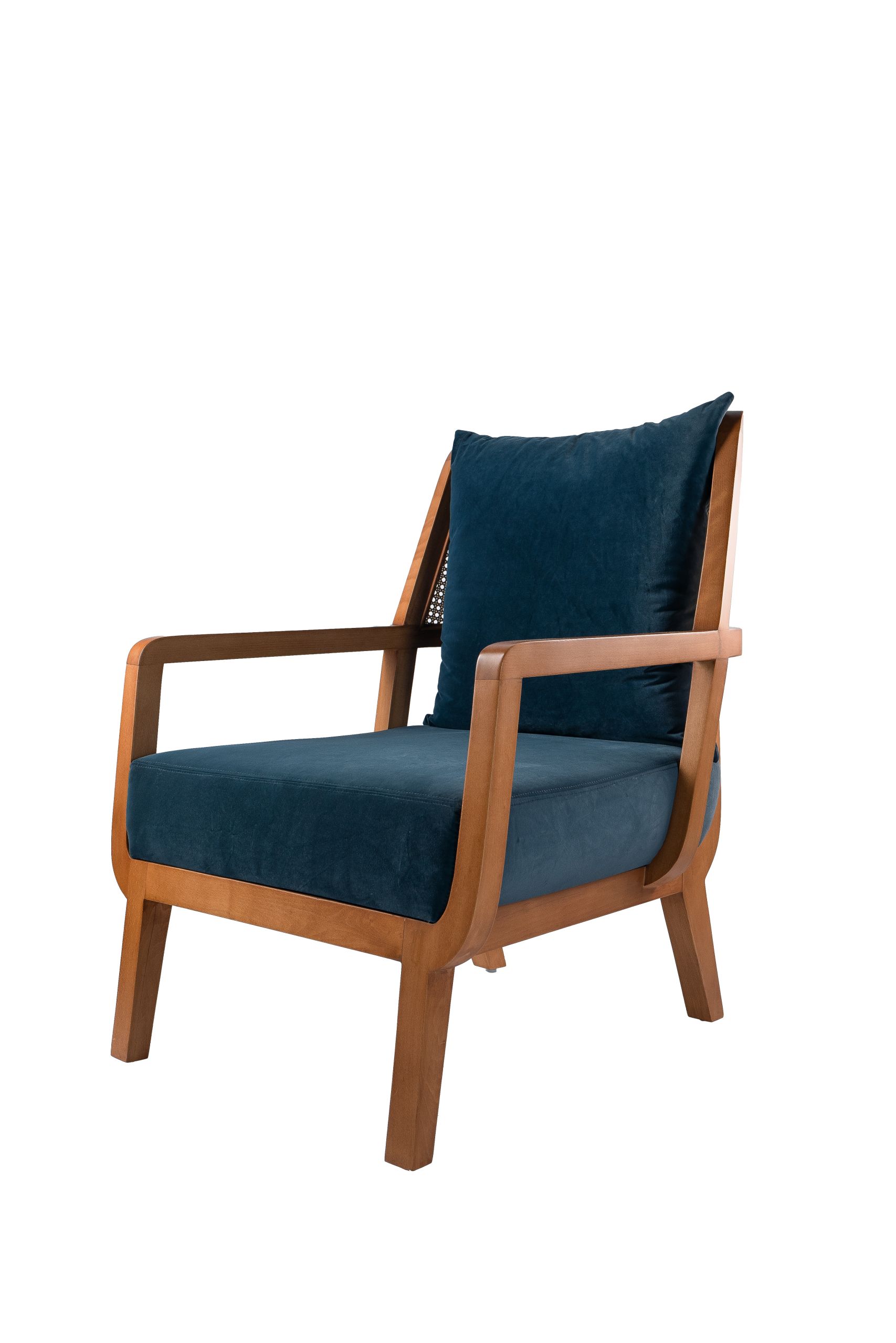 The RETRO chair blends classic design with a modern spirit. It features a sturdy wooden frame and a handwoven natural rattan backrest, adding warmth and elegance. The cushioned fabric seat provides maximum comfort, while the smooth armrests and clean lines give it a refined look suitable for various interiors. A perfect decorative piece for living rooms, reading corners, or stylish relaxation areas.