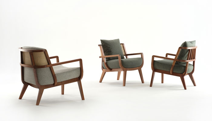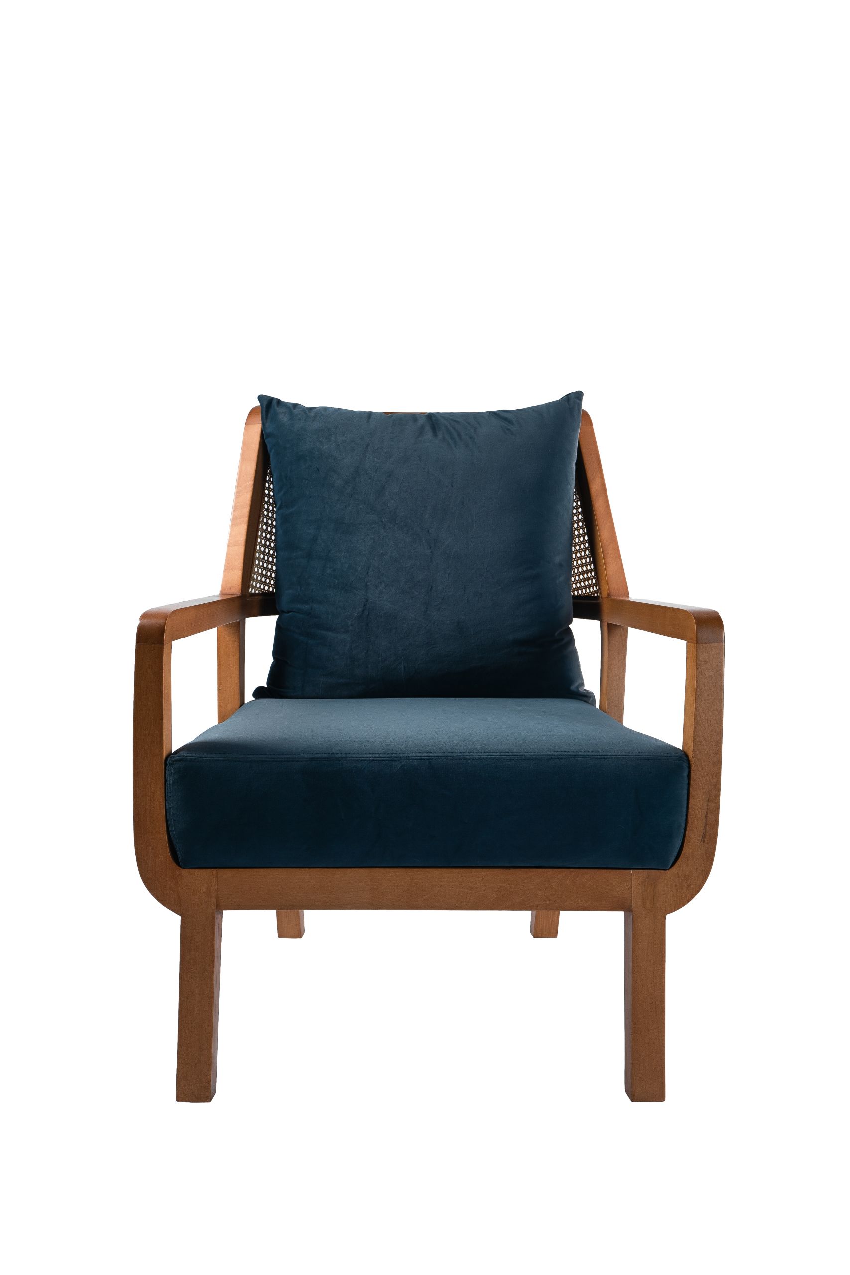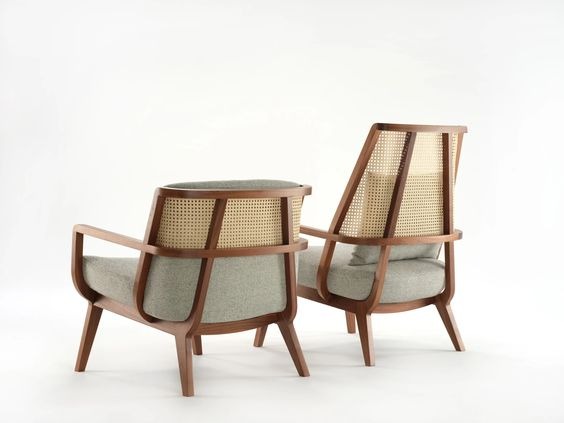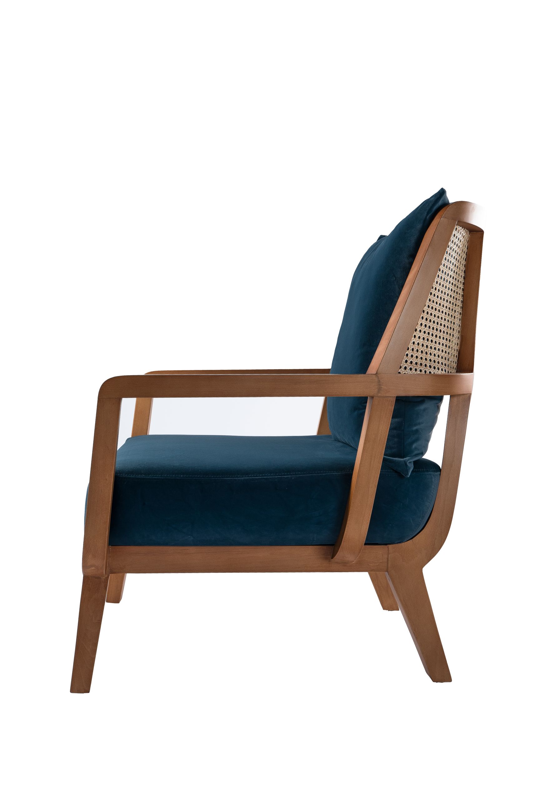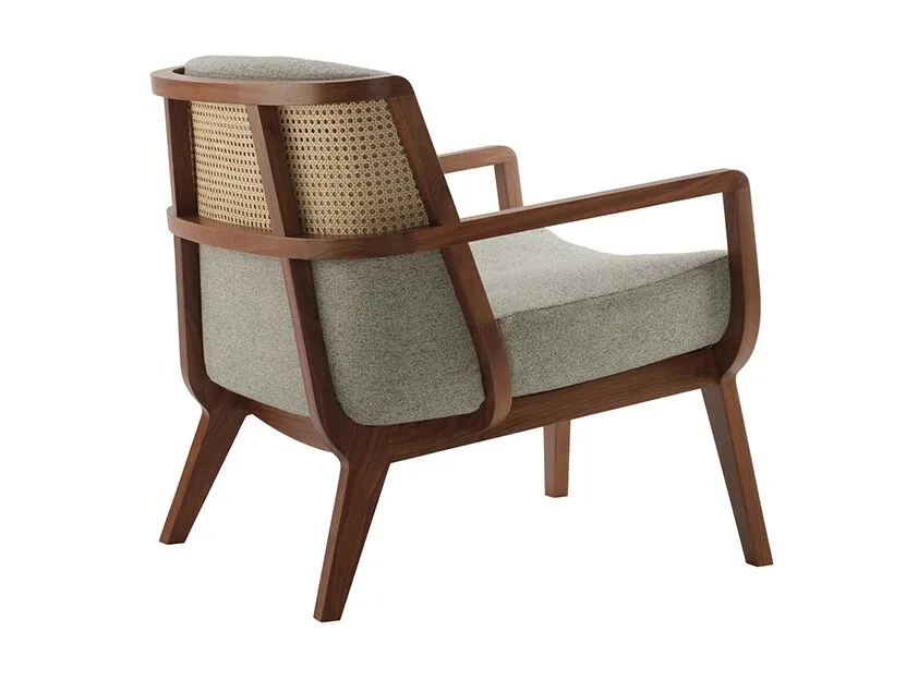 The RETRO chair blends classic design with a modern spirit. It features a sturdy wooden frame and a handwoven natural rattan backrest, adding warmth and elegance. The cushioned fabric seat provides maximum comfort, while the smooth armrests and clean lines give it a refined look suitable for various interiors. A perfect decorative piece for living rooms, reading corners, or stylish relaxation areas.